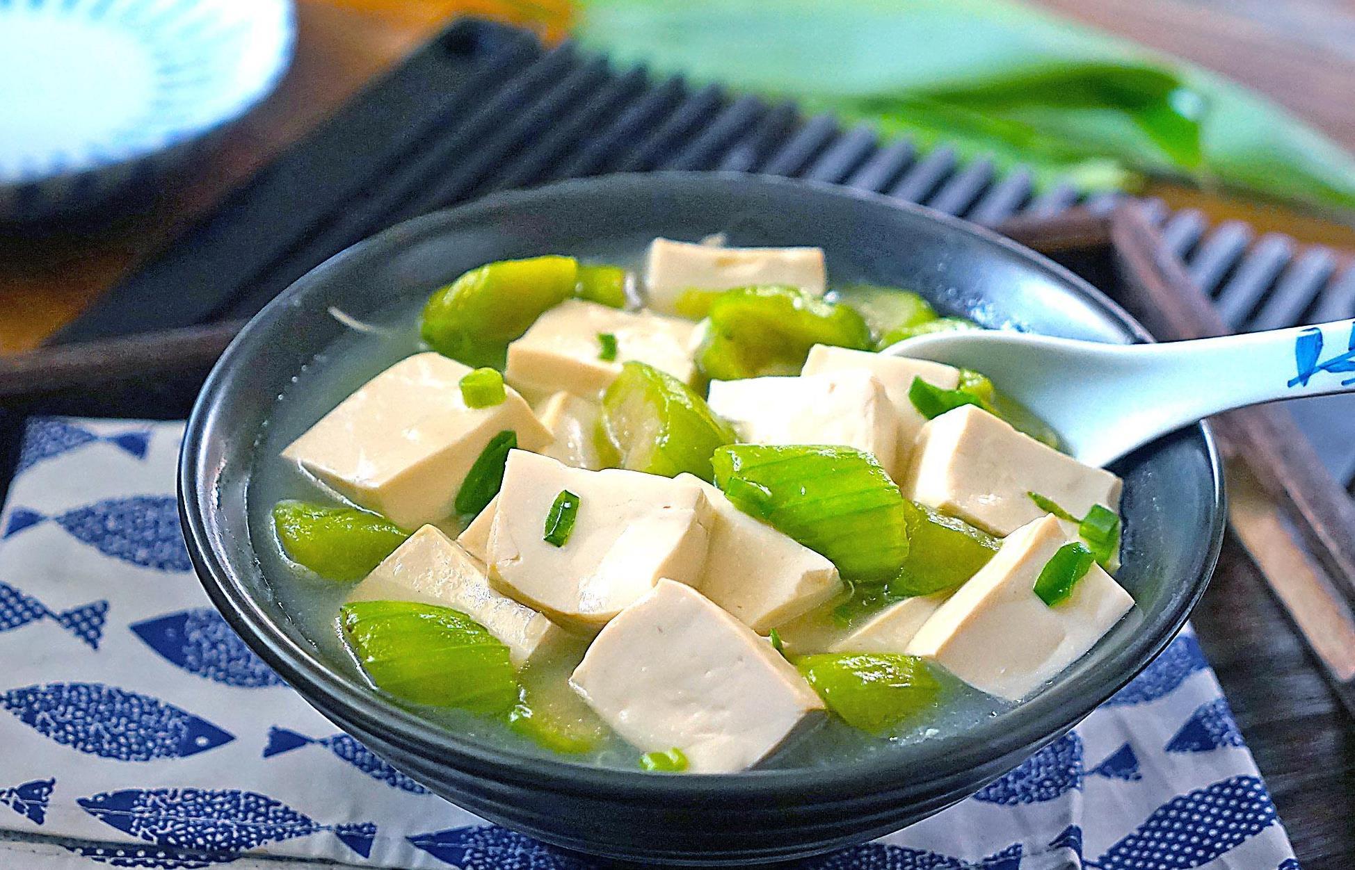 食材:丝瓜、嫩豆腐、大蒜头、干辣椒、葱、淀粉、姜丝、高汤
