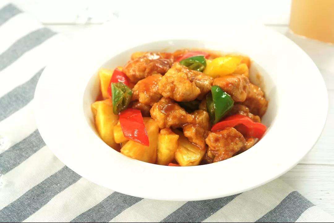 【菠萝咕咾肉】 食材: 菠萝、猪肉、青椒、生抽、料酒、淀粉、番茄酱、醋、白糖。 做法: 1、猪肉切块,用生抽和料酒腌制一下。 2、腌好的肉在淀粉里滚…更多