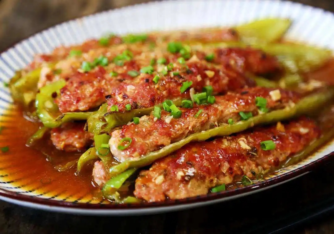 【尖椒酿肉】 食材: 尖椒 8-10个、肉馅 250克 、葱花 、姜末、胡椒粉、生抽 2勺、料酒1勺、老抽 1勺、蚝油 1勺 、糖 10克、 盐、香油 1勺 、鸡蛋 1个、…更多
