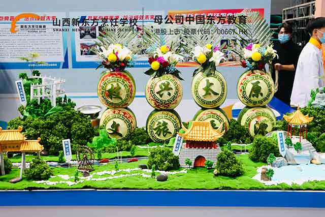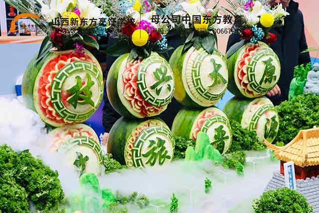 新东方烹饪学校始终坚信,技能是激活文旅发展的关键力量。当西瓜雕刻与晋源风光相遇,不仅让传统烹饪技艺突破“餐桌”边界,拥有了文化表达的新载体,更让晋源文旅名片增添了创意亮色与鲜活新意。独具匠心的展台引得参会领导、嘉宾及现场观众纷纷驻足观赏、拍照打卡。多位莅临展台的领导细细品鉴后,连连称赞作品“构思精巧、技艺绝伦,堪称巧夺天工”,既高度认可学校在技能人才培养上的扎实功底与创新理念,更对学子们将匠心融入技艺、用技能传播文化的专业态度给予充分肯定。