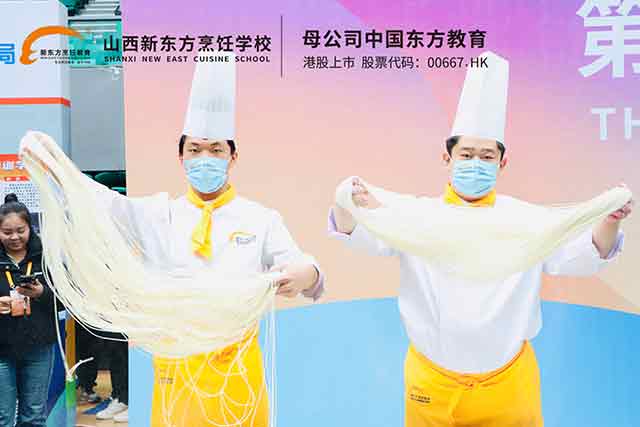 静态展台的视觉盛宴尚未落幕,动态的面艺绝技表演便将现场气氛推向高潮。学校学子身着统一服装登台,手中的面团在指尖灵活翻飞、变幻无穷,刀削面、龙须拉面、高跷剪刀面等技艺,学子们动作娴熟流畅,眼神专注坚定,每一个技法都尽显千锤百炼的扎实功底,赢得现场阵阵雷鸣般的掌声与喝彩声,让观众沉浸式感受到中华传统烹饪技艺的独特魅力与职业技能的无限可能。