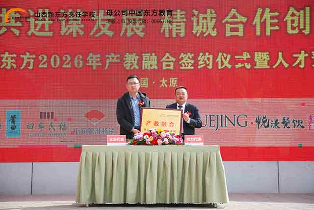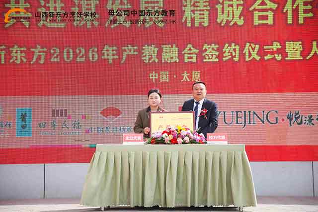 在全场热烈的掌声中,产教融合授牌仪式隆重举行。山西新东方职业学校王校长为合作企业授牌,标志着校企双方正式建立长期稳定、深度融合的战略合作伙伴关系。未来,校企双方将在专业共建、课程共研、实训共享、人才共育、定向培养、就业共推等领域开展全方位合作,把企业岗位标准、行业技术前沿、市场发展需求深度融入教学全过程,推动人才培养与企业需求精准对接、无缝衔接,进一步夯实学校产教融合发展根基,为广大学子实现高质量、稳就业、优发展提供坚实保障与强力支撑。