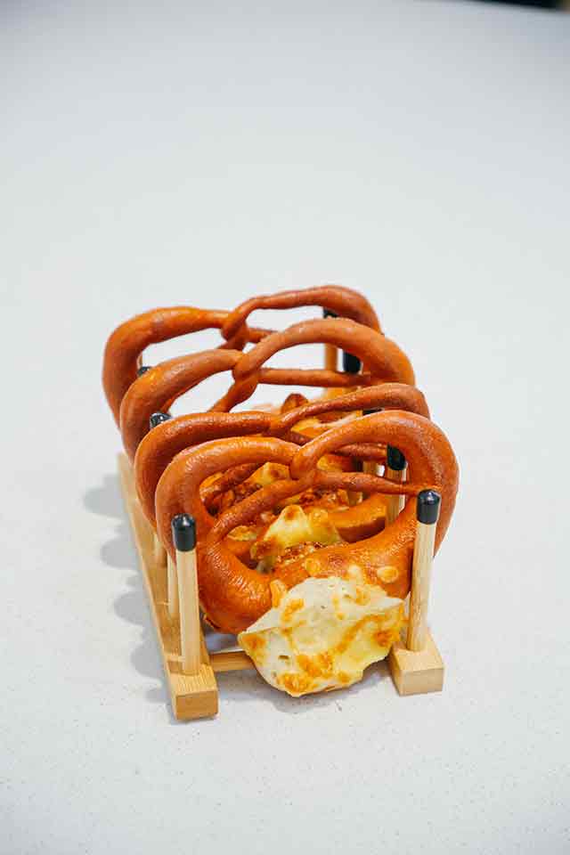 本次展出的贝果系列,涵盖经典与创新双赛道:原味贝果柔韧有嚼劲,鸡排贝果三明治满足饱腹刚需,芝士青椒贝果清爽解腻,墨鱼贝果以独特色泽与鲜香口感打造视觉与味觉双重惊喜。碱水系列更是亮点纷呈:碱水条、碱水球造型简约、麦香浓郁,芝士碱水结层次丰富、咸香适口,火腿碱水三明治适配快节奏生活,川味碱水球融入本土风味,打破传统边界,实现西式工艺+中式口味的完美融合。这些作品既是课堂教学成果,也是市场热销爆款,充分印证山西新东方教学紧贴市场、技能对接就业的办学优势。
